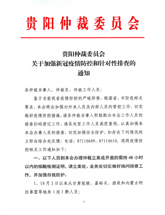 贵阳仲裁委员会关于加强新冠疫情防控和针对性排查的通知