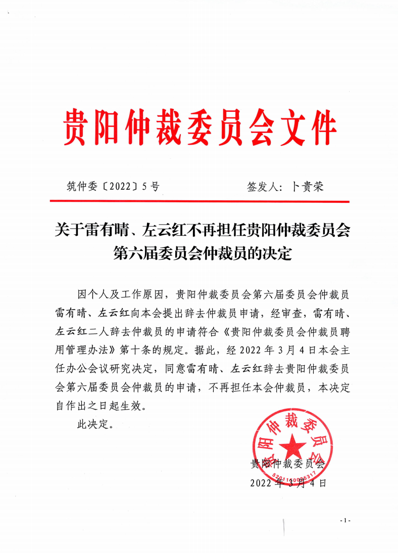 关于雷有晴、左云红不再担任贵阳仲裁委员会第六届委员会仲裁员的决定 (筑仲委〔2022〕5号)