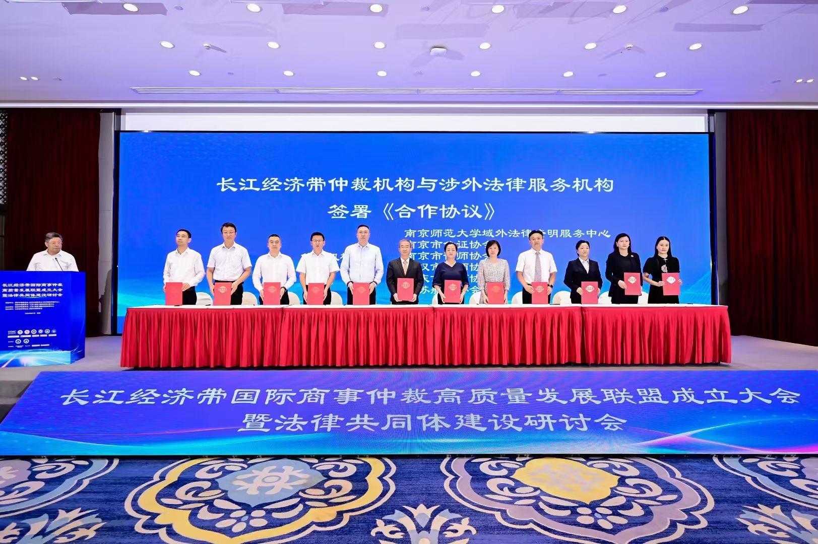 会上,长江经济带12家仲裁机构共同签署《合作协议》,并与武汉大学、西南政法大学、南京大学、东南大学4家高校法学院,以及南京市公证协会、南京市律师协会、武汉市律师协会、重庆市律师协会、中国法治现代化研究院、江苏省船东协会6家涉外法律服务机构达成合作。系列合作签约,是长江经济带区域内法律共同体凝聚法治共识与合作共识的工作成果,是构建区域一体化仲裁法律服务体系的重要举措,必将进一步推动各方开展更加深入、更加全面的交流与协作,为打造长江经济带国际商事仲裁高地贡献更多智慧和力量。