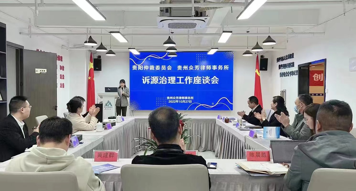 为认真贯彻落实3月15日与贵阳市律师协会联合下发的《关于推行仲裁方式开展诉源治理的通知》要求,10月27日下午,我委主任卜贵荣一行来到贵州众芳律师事务所(以下简称“众芳所”)开展诉源治理工作座谈。